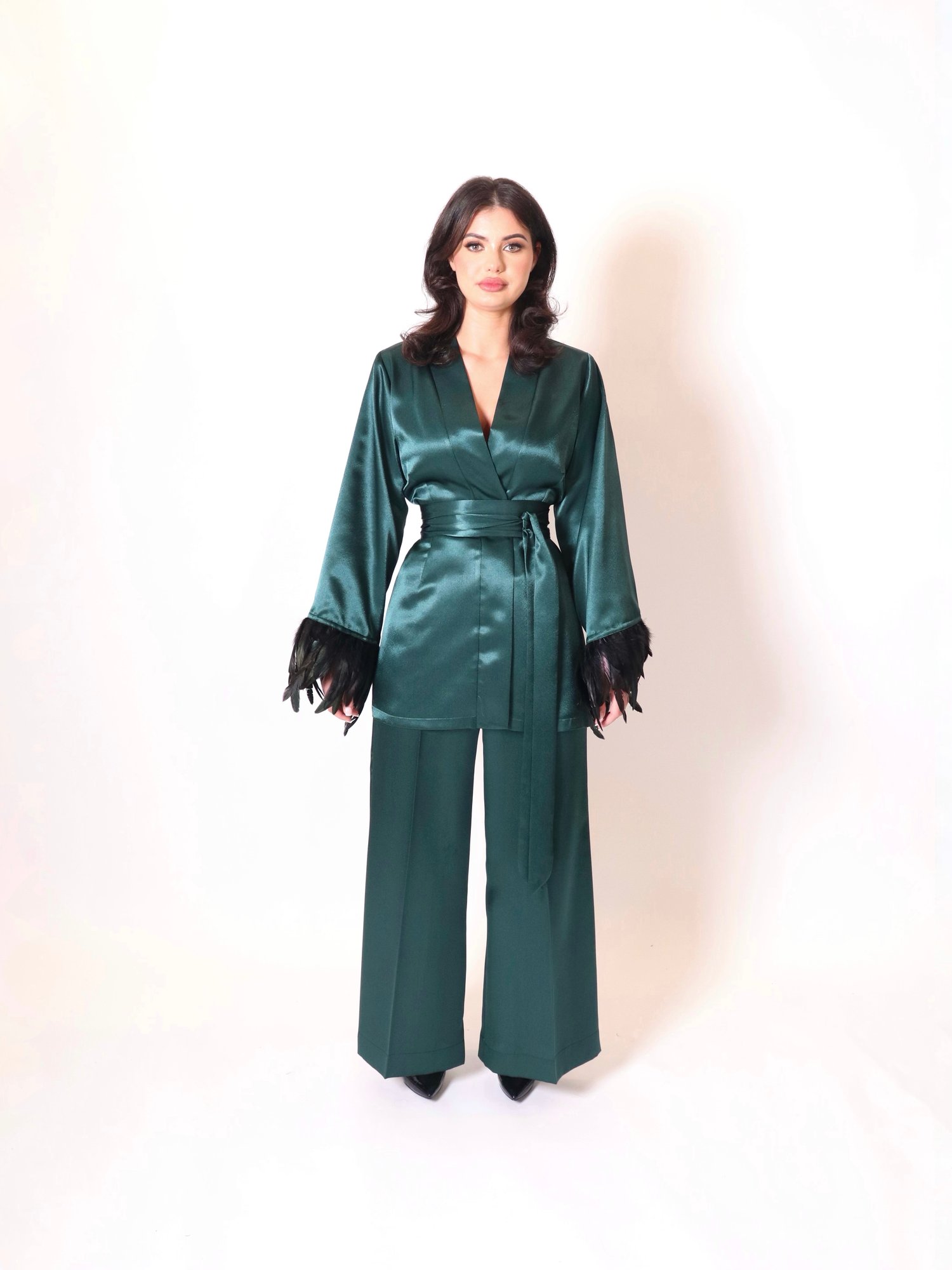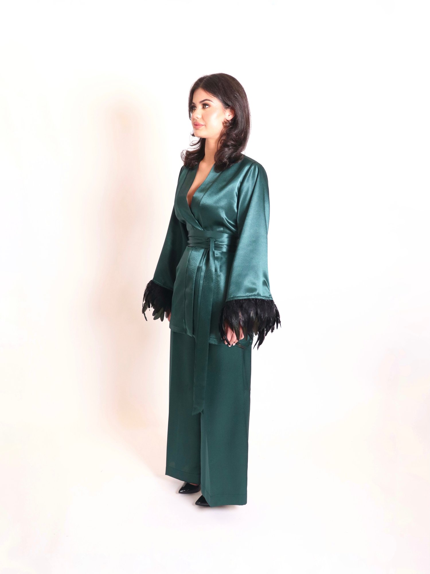 Liyas Bazaar's well-awaited feather co-ordinate; a kimono-style jacket with flared, feather trimmed sleeves, featuring a long, versatile belt that can be tied and adjusted in multiple ways. The trousers are long and flared, to compliment the cut of the jacket, featuring an elasticated drawstring waist that can be adjusted accordingly. The jacket and trousers are not sold separately. We do not provide refunds or exchanges so please ensure you choose your size once visiting our 'Size-Guide' page.